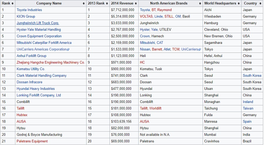 Còn ở tại Việt Nam có những hãng xe Forklift như: HELI – KOMATSU – YALE – HUYNDAI – TCM – NISSAN – CAT – MITSUBISHI,…Bảng hạng đánh giá được đánh giá theo lượng xe được cung cấp ra ngoài thị trường theo năm.